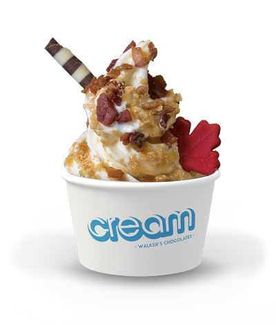 maple syrup, burnt caramel, topped with maple sugar flakes, bacon, chocolate sprinkles and chocolate swirl and red chocolate mapple leaf