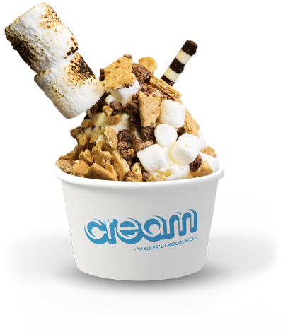 hot fudge, graham crackers, chocolate chunks, marshmallows, marshmallows sauce, chocolate swirl
