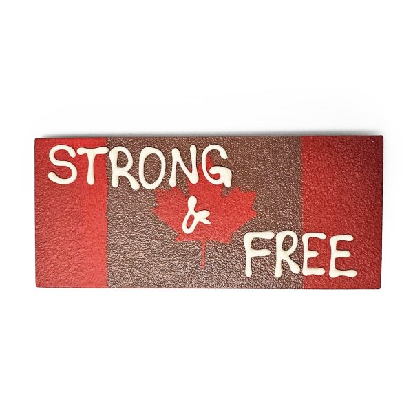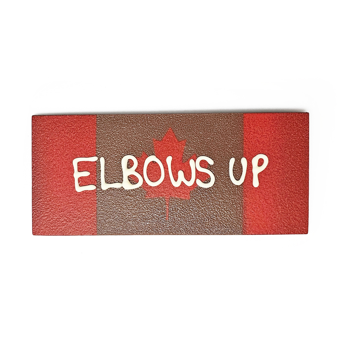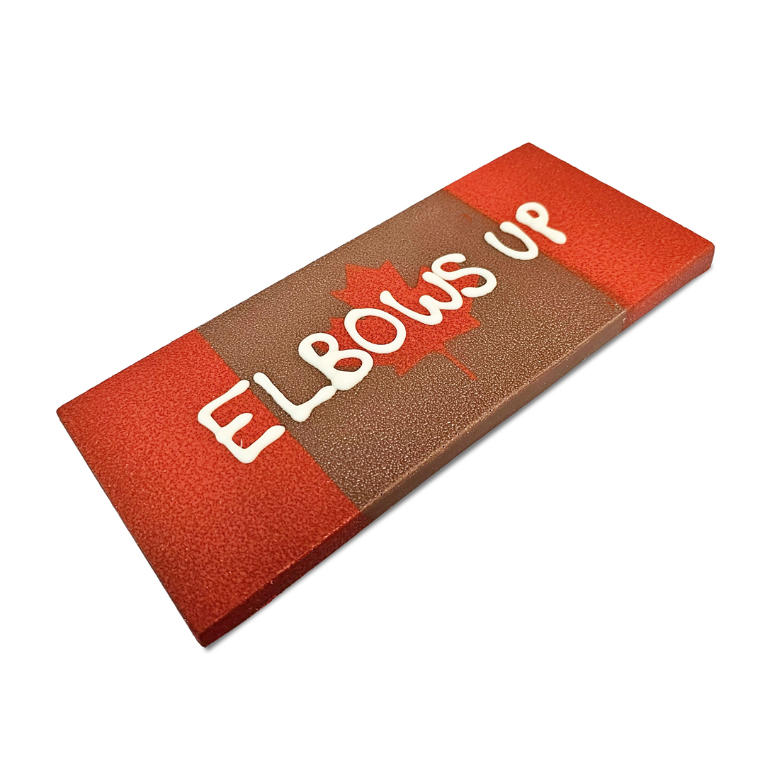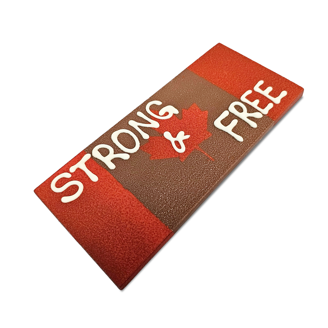 Pure milk chocolate bar with Canadian flag stencilled in coloured cocoa butter with white chocolate lettering.