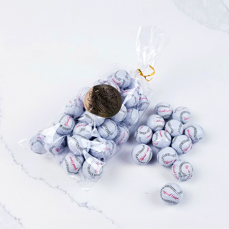 Foil wrapped milk chocolate baseballs.  200g bag,