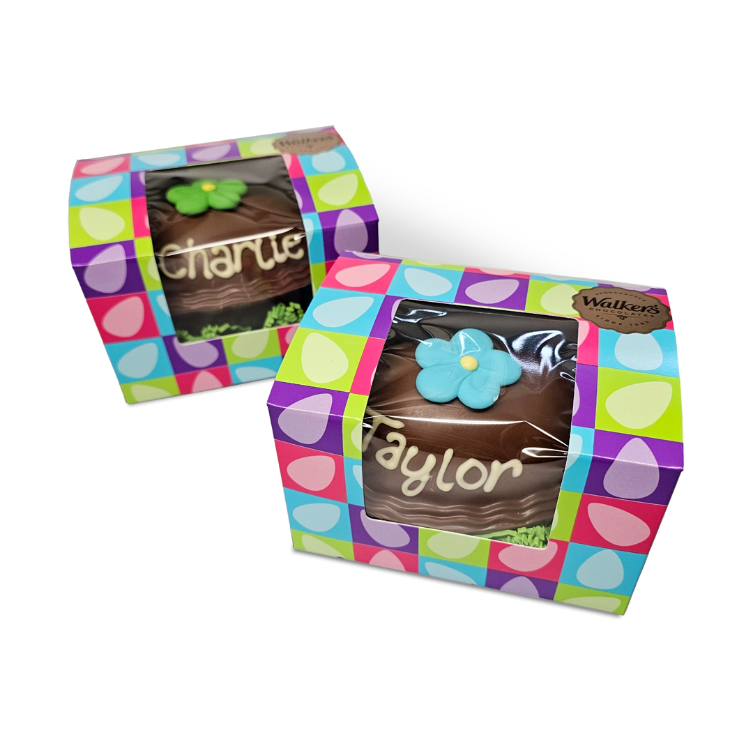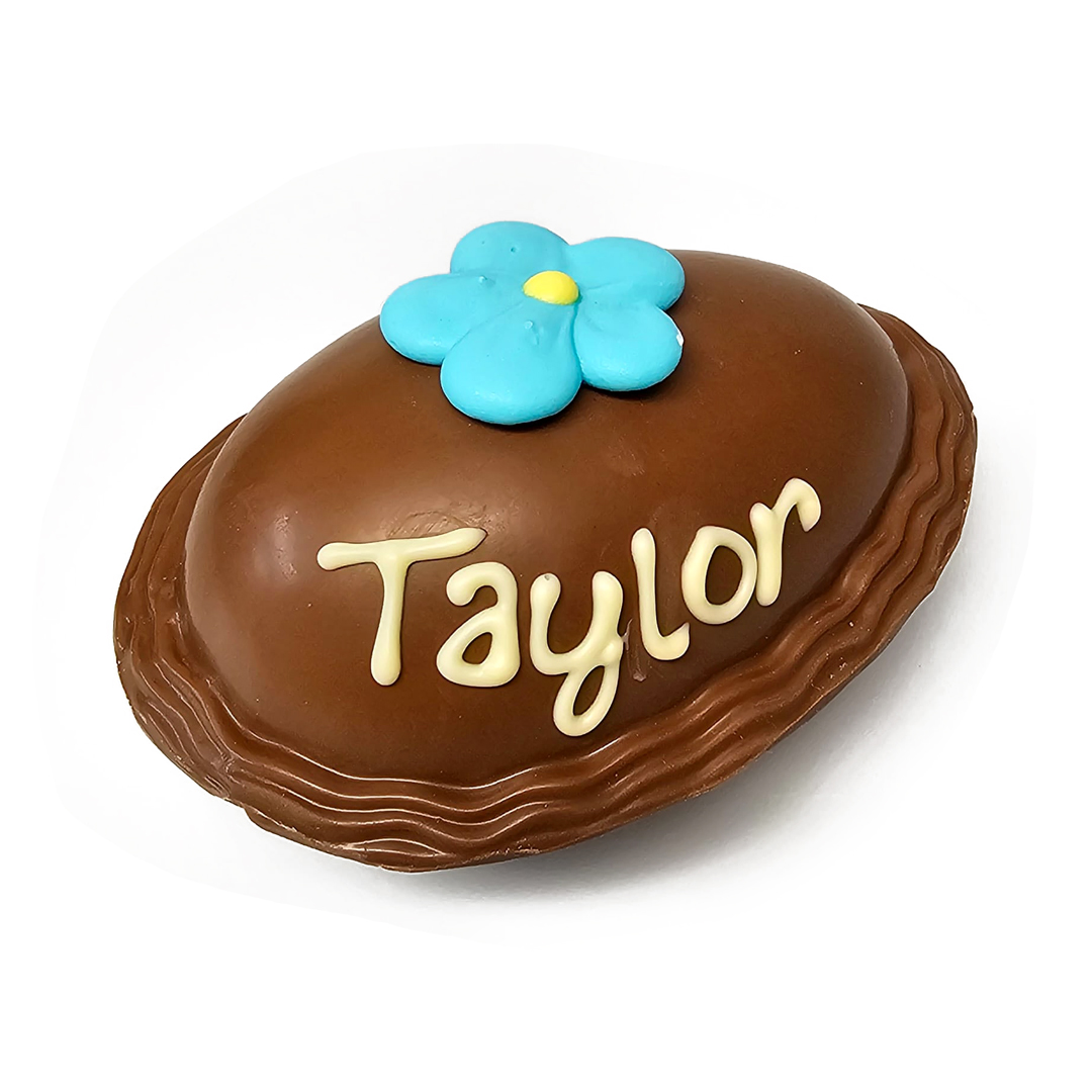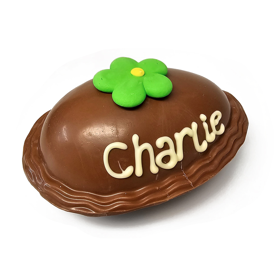 Hollow milk chocolate frilled egg, with hand written name and sugar decoration.