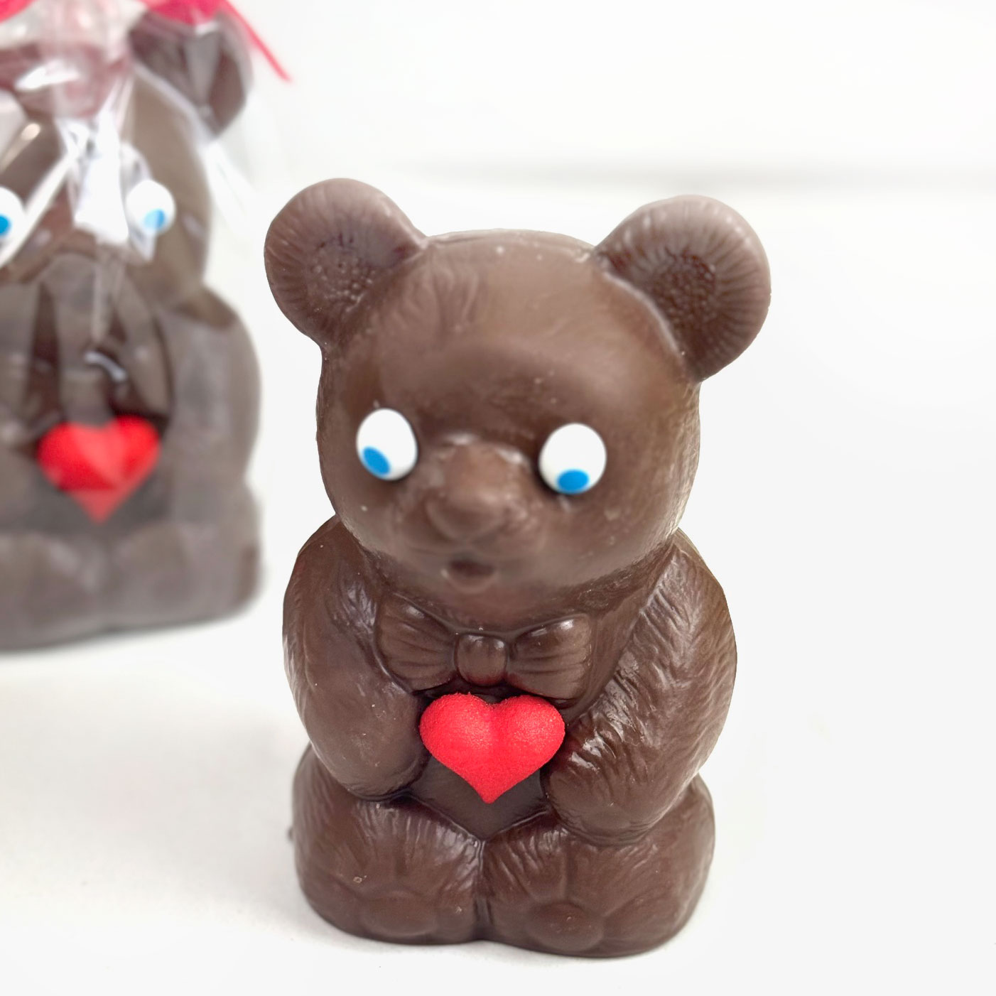 Hollow milk chocolate bear with icing heart.